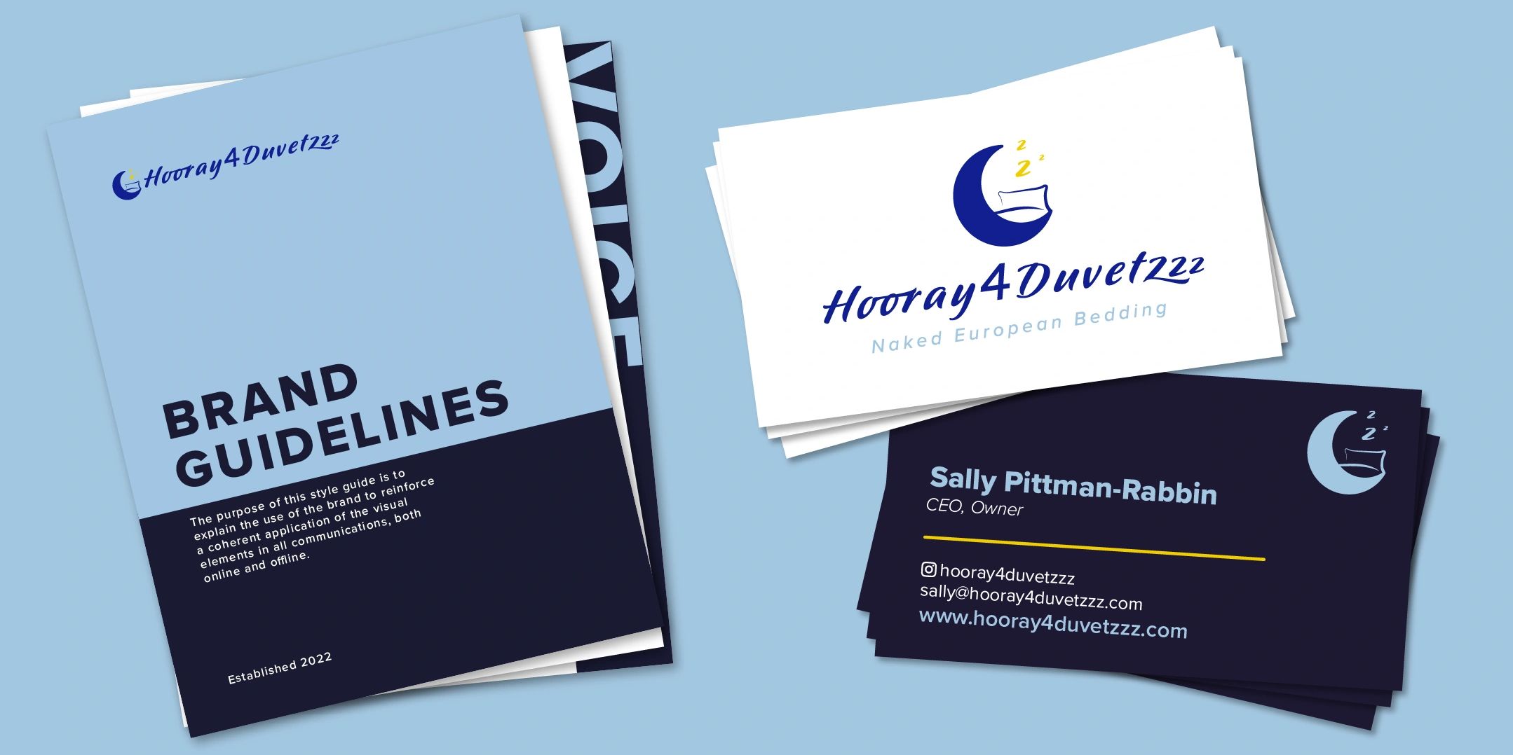 The logo design and branding process began with a thorough understanding of the business owner's preferences, leading to the presentation of initial logo sketches and concepts. Following this, color was thoughtfully applied, utilizing principles of color theory and psychology; a dominant palette of blues was chosen to convey trust and professionalism, while a splash of yellow was incorporated to infuse joy without overwhelming the design. Additionally, research into competitors in the same industry informed the target demographics and tone of the branding, providing essential guidelines for the design. Despite this research, Hooray4Duvetzzz's product ultimately emerged as distinctly unique within the market, ensuring that the final brand guidelines effectively set it apart.